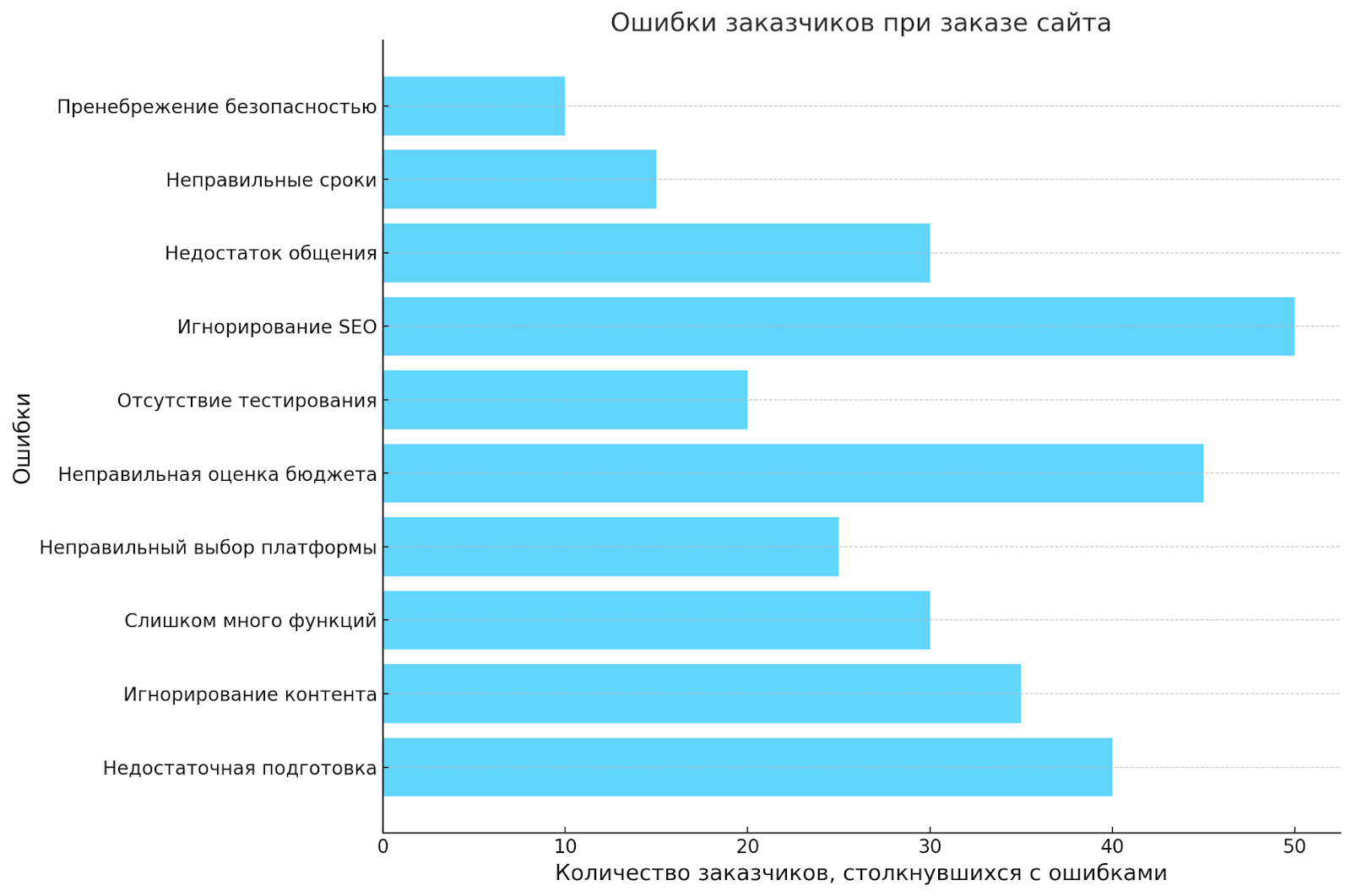 • Недостаток функций: В то же время некоторые заказчики могут недооценивать важность определенных функций, таких как онлайн-чат, система поиска или форма обратной связи, что может негативно сказаться на взаимодействии пользователей с сайтом.